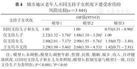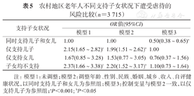 城市老年人中,模型2中与同时支持儿子和女儿组老年人相比,仅支持儿子、仅支持女儿、同时不支持儿子和女儿的老年人受虐风险均增加,OR值(95%CI)分别为1.88(1.10~3.20)、2.99(1.55~5.76)、2.68(1.58~4.53),见表4。