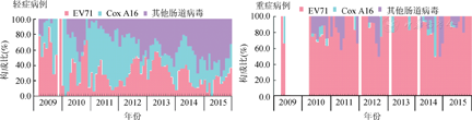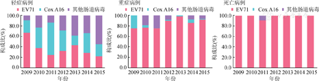 轻症病例2009-2015年的优势病原依次是EV71、Cox A16、Cox A16、Cox A16、EV71、Cox A16和其他肠道病毒。EV71是重症和死亡病例的优势病原,且EV71在死亡病例中优势更明显(图1)。