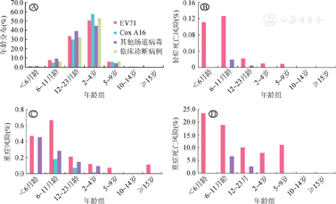 临床诊断病例和确诊病例的易感人群主要为6月龄~5岁婴幼儿。重症和死亡病例发生风险的高发年龄段为6~11月龄。随着年龄增大,发生重症和死亡的风险变小。发生死亡、重症以及重症导致死亡的病原中EV71占绝对优势,其次是其他肠道病毒(图2)。