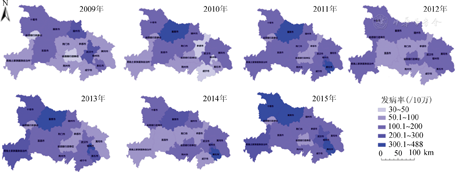 手足口病是由肠道病毒71型(EV71)、柯萨奇病毒A组16型(Cox A16)等多种肠道病毒血清型感染引起的常见儿童传染性疾病。1969年,美国加利福尼亚州首次从婴儿粪便标本分离出EV71[1]。手足口病在马来西亚、中国台湾、日本、新加坡、越南等亚太地区广泛流行[2,3,4,5,6]。1998年,深圳市首次分离出EV71。近15年来,我国婴幼儿人群中手足口病暴发和流行日趋严重,手足口病病例死亡事件多发[7,8]。2008年5月我国将手足口病纳入法定报告传染病进行监测。湖北省一直是手足口病高发省份,为及时掌握手足口病流行病学和病原学特征,现对2009-2015年湖北省手足口病流行病学资料进行回顾性分析。