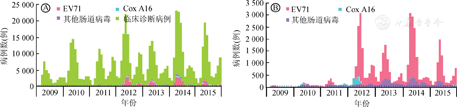 注:A:EV71、Cox A16、其他肠道病毒和临床诊断病例数的时间分布;B:EV71、Cox A16和其他肠道病毒病例数的时间分布