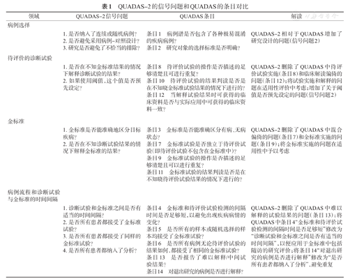 | 1. 是否纳入了连续或随机病例?2. 是否避免采用病例-对照设计?3. 研究是否避免了不恰当的排除? | 条目1 病例谱是否包含了各种极易混淆的疾病病例?条目2 研究对象的选择标准是否明确? | QUADAS-2相对于QUADAS增加了研究设计的问题(信号问题2) | |