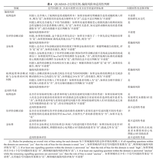 | 病例选择 | 问题1:是否纳入了病例的连续或随机样本?如果原始研究明确报告连续或随机纳入样本,则为"是";如果使用非连续或方便样本为"否";信息不足以判断为"不清楚"问题2:研究是否避免了不恰当的排除?如果所有通常都接受心肌肌钙蛋白检测的疑似急性冠脉综合征患者都纳入研究,为"是";如果有关患者,如无冠状动脉疾病史的患者被排除为"否";报告的数据不足以判断为"不清楚"偏倚风险整体评价a | 不清楚原始研究未交代是不清楚 | |