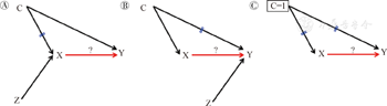 (1)第一种策略:混杂路径打断法。依据DAGs的规则,打断混杂路径上的任一因果关系,这样混杂路径自然消失,即可起到控制混杂的作用。具体可分为:①打断C→X(图3A):相当于暴露干预完全法。通过设置合适的外部变量(Z)进行干预,即相当于在混杂结构的基础上建立人为的因果路径Z→X。若暴露X完全由Z所决定,此时C→X自然不成立,从而起到打断混杂路径的目的。这类设计即随机对照试验(Randomized Control Trials,RCTs),当随机化方法(Z)完全决定了研究对象的X取值(图3A),即Z=X。该策略适用于上述混杂的所有4种情形,即已知和未知的、可测量和不可测量、已测量和未测量的混杂均可有效控制。理论上说此时X-Y效应估计不受混杂因素测量与否的影响,这也是在进行因果关系研究时RCTs优于其他设计的结构基础。②打断C→Y(图3B):同样通过设置外部干预变量Z,即相当于在混杂结构的基础上建立人为的因果路径Z→Y;此时对Y的决定因素包括了混杂C、干预变量Z和拟估计的暴露X。理论上来说,如能恰好获得合适的变量Z,可使得C→Y的效应恰好为Z→Y的效应所抵消,则混杂得以控制。然而实际上的操作相当困难。③同时打断C→X和C→Y(图3C):第一种:限制法,如性别为混杂,则研究对象只招募男性或女性;第二种:分层法,如性别为混杂,则通过分层法分别在男性或女性人群中研究X-Y的关系。此时C取值只有一个固定值,因此双路径(C→X和C→Y)同时不成立(被打断)。在分析阶段时,通过分层分析、多因素分析等手段来调整C,可同样达到混杂控制的效果,这也是数据分析阶段唯一可以实现的控制手段。这种策略适用于上述混杂的第一种情形,即混杂已知、可测量并且在实际研究实施中已进行了测量。这也是现有因果关系研究中混杂控制最为常用的策略之一。