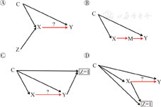 影响X-Y效应估计的因素众多,依据混杂的共病因结构(图1),可将其区分为混杂因素和非混杂因素。前者又可根据是否已知、可测量及具体是否测量等情况,将混杂分为4种情形(图2)。
