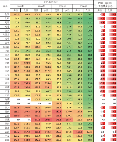| 年龄组(岁) | 死亡率(/10万) | 1981-2010年年均变化率(%) | ||||||