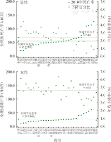总体表现为东低西高。北京市、天津市、上海市、江苏省、浙江省、广东省等东部省份青少年全死因死亡率最低,而位于西部的青海省、贵州省、云南省、西藏自治区、宁夏回族自治区、新疆维吾尔自治区、四川省、甘肃省青少年的死亡率较高,中部省份青少年死亡率介于东部和西部省份之间。2010年男性青少年死亡率最低的省份为上海市(21.1/10万),最高的省份为青海省(163.3/10万);女性最低的省份为北京市(9.3/10万),最高的省份为青海省(123.1/10万)。1981-2010年青少年男性死亡率年均下降率最大的省份为北京市(4.4%),最小的省份为青海省(0.1%);女性最大的省份为湖北省(6.4%),最小的省份为青海省(0.8%)。每个省份男性的年均死亡率下降率均低于女性。2010年全死因死亡率高于全国平均水平的省份,1981-2010年年均下降率也低于全国平均下降率。见图1,图2。