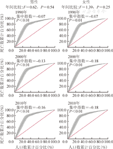 将人均GDP作为地区社会经济水平指标,1990、2000和2010年男性青少年死亡集中指数分别为-0.07(95%CI:-0.11~-0.03)、-0.13(95%CI:-0.18~-0.08)和-0.16(95%CI:-0.22~-0.10),女性分别为-0.07(95%CI:-0.13~-0.02)、-0.18(95%CI:-0.24~-0.12)和-0.18(95%CI:-0.26~-0.09),且社会经济发展水平低的省份拥有较高的死亡水平。男、女性集中指数在1990、2000和2010年这3个年度之间差异均无统计学意义(P>0.05)。见图3。