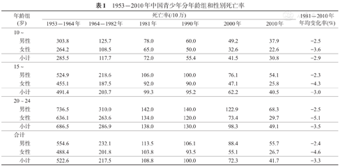 分析1953-2010年中国10~24岁青少年全死因死亡率的趋势和地区差异。