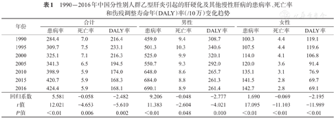 自1990年以来,无论男性、女性,还是全体人群,乙型肝炎引起的肝硬化及其他慢性肝病的患病率均呈现显著上升的趋势(P<0.01),根据回归系数判断,男性患病率上升趋势高于女性。死亡率和DALY率均呈现下降的趋势(表1)。