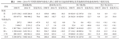 1990-2016年不同性别和年龄组人群乙型肝炎引起的肝硬化及其他慢性肝病患病和死亡情况变化