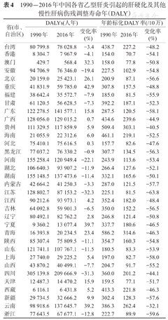 与1990年相比,中国2016年乙型肝炎引起的肝硬化及其他慢性肝病患病和死亡人数分别增加了79.6%和2.4%。患病率增加了49.2%,男性患病率的增幅(50.3%)高于女性(42.3%),15~49岁年龄组人群患病率增幅最大(33.2%)。男性死亡数和DALYs数均呈现上升的趋势,变化率分别为13.6%和2.2%。2016年,年龄标化DALY率排名前五位的省份为青海省(314.6/10万)、贵州省(303.1/10万)、云南省(262.4/10万)、广西壮族自治区(239.6/10万)和台湾省(227.2/10万)。