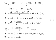 模型(1)是适合COVID-19传播和我国追踪隔离等防控特点的数学模型。在该模型中,自然传播过程的人群分为易感者类(S)、潜伏者类(E)、感染者类(I)、疑似病例类(B)、住院者类(H)和恢复者类(R)。由于密切跟踪隔离措施的实施,与感染者密切接触的人群分为隔离的易感者类(Sq)和潜伏者类(Eq)。通过感染者密切接触追踪,假设q比率的接触者被隔离,其中被隔离的个体若被感染,则该个体隔离在Eq仓室,否则隔离在Sq仓室。若比率为1-q的接触者在追踪中被遗漏,一旦被有效感染则移动到E仓室,否则仍然留在仓室S中。设每次接触时传播概率为β,接触数为c。被隔离的个体中,如果被感染(或未感染),则以βcq[或(1-β)cq]的速率移动到仓室Eq(或Sq)。若未被隔离且被感染,则以βc(1-q)的速率转移到仓室E。感染者个体被确诊的速率为δI,并以γH的速率恢复到仓室R。如果考虑由于发热门诊有人进入到疑似病例仓室的实际情况,模型中统一记成仓室B。函数PE(t),PI(t),PB(t)和PH(t)分别表示输入到潜伏类、感染类、疑似类和确诊类的病例数,可由泊松分布刻画。模型其他参数和意义见表1。