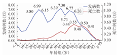 2017年我国结核病发病数约有83.10万,年龄标化发病率为54.18/10万;男性(52.09万)的发病数是女性(31.01万)的1.68倍(表1);不同年龄组人群中,20~30岁及45~65岁人群的发病数最多,≥65岁人群随着年龄增长,发病数逐渐下降(图1)。2017年我国约有3.93万人因结核病死亡,年龄标化死亡率为2.17/10万;男性(2.77万)的死亡数是女性(1.15万)的2.41倍(表1);不同年龄组人群中,60~80岁人群的死亡数最多(图1)。