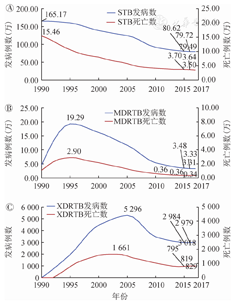 1990-2017年STB的发病数和死亡数均呈现逐年下降的趋势(图3A),1990年的发病数及死亡数最高,分别为165.17万、15.46万,年均递降率分别为2.67%、5.35%。MDRTB的发病数及死亡数呈现先升后降的趋势(图3B),且均是1995年最高,分别为19.29万、2.90万;1995年之后逐年下降,年均递降率分别为7.70%、9.28%。XDRTB的发病数和死亡数也呈现先升后降的趋势(图3C),发病数最高的是2005年的5 296例,之后呈下降趋势,年均递降率为4.63%;死亡数最高的是2003年的1 661例,之后呈下降趋势,年均递降率为5.24%;但2017年的发病数(3 018例)较2016年(2 979例)增长了1.32%,2017年的死亡数(829例)较2016年(819例)增长了1.22%。