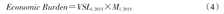 式中:VSLl,2015为式(3)所计算的统计寿命价值;Ml,2015为第l个城市的PM2.5归因死亡人数。本研究利用R语言(3.6.1版本)进行统计分析。
