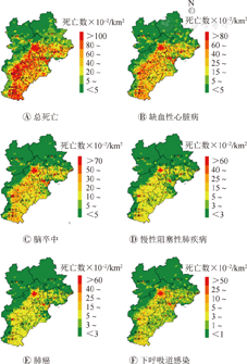 PM2.5归因死亡数的空间分布特征见图3,可见疾病别的归因死亡数分布较为近似,且其分布与污染浓度和人口密度的分布基本一致,多集中在中心地带及其周边城市,呈现"北低南高,东高西低"特征。其中,PM2.5归因总死亡数排名前5的城市为北京市、天津市、保定市、石家庄市和邯郸市(表2)。不同城市间的疾病死因构成基本一致,首要死因均为缺血性心脏病与脑卒中。为排除人口基数对估计结果的影响,本研究进一步计算了PM2.5归因死亡率,其所得排名前5的城市分别为衡水市、沧州市、廊坊市、石家庄市与邢台市(表2)。