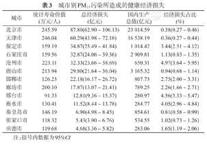 PM2.5污染在造成严重健康危害的同时还导致了重大的经济损失,不同城市间存在较大的差异。PM2.5污染所造成的健康经济损失值主要取决于该地区的统计寿命价值与PM2.5归因死亡人数。如沧州市(1.45万人)PM2.5归因死亡人数低于邯郸市(1.76万人),但由于其单位寿命价值较高,使得沧州市(32.33亿元)健康经济损失值明显高于邯郸市(22.18亿元)。同时,本研究PM2.5健康经济损失的估计结果高于既往研究[26]。差异原因除了统计寿命价值估计值的细微差别外,主要在于本研究所估计出的超额死亡结果显著高于既往研究。除此之外,在考虑城市GDP水平的差异之后,以经济损失占城市GDP比重反应PM2.5健康经济负担,发现经济负担的高值城市从北京市、天津市和保定市等中心城市向西南方向偏移,邢台市、衡水市和邯郸市等城市将成为新的排名前5的高经济负担城市,如北京市的经济损失绝对值是衡水市的9倍,然而衡水市的经济损失占比是北京市的10倍。由此可见,纵使周边城市的经济损失值相对较低,其PM2.5污染所导致的经济负担可能较大。