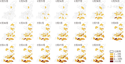 随着时间的推移,出现确诊病例的地区不断扩大,到1月29日陕西省所有地市均有确诊病例报告。以西安市报告病例数最多(120例),占全省报告总病例数的48.98%,其次为安康市(26例)和汉中市(26例),均占10.61%。截至2月22日陕西省COVID-19报告发病涉及10市55县(区),其中累计报告发病例数超过10例的县(区)为西安市莲湖区20例、西安市雁塔区16例、西安市新城区15例、西安市未央区14例、西安市碑林区13例、汉中市西乡县11例。报告病例的时空分布见图2。