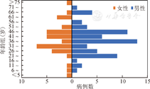 陕西省报告确诊病例中,男性131例(占53.47%),女性114例(占46.53%),男性发病率为0.66/10万,女性发病率为0.61/10万。年龄3~89岁,中位年龄为46岁,其中男性集中在21~50岁,女性集中在31~50岁。见图3。