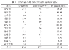 陕西省COVID-19的疑似病例目前已全部清零。疑似病例在报告后会有不同的转归,一部分确诊为COVID-19病例,一部分经过诊断后排除。截至2月22日24:00,导出大疫情系统的所有病例信息,对疑似病例转归进行分析,结果显示有15.18%(157/1 034)的疑似病例最终转为确诊病例。但在不同地区这一比例存在较大差异。见表1。
