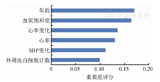 然后将XGBoost模型中所用的输入变量进行重要性评分(图1),最终入选的变量(按照重要性排序)为年龄、血氧饱和度、心率变化(入院后第二次测量值减去第一次测量值)、心率、SBP变化(入院后第二次测量值减去第一次测量值)、外周血白细胞计数。变量体温变化虽具有较高的预测能力,但与其他预测变量具有共线性或者较高的相关系数,所以未纳入模型。