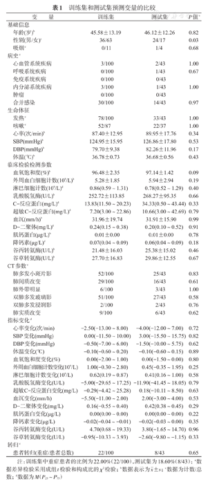 注:训练集中重症患者的比例为22.00%(22/100),测试集为18.60%(8/43);a数据差异检验采用成组t检验和构成比的χ2检验;b数据表示为