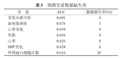 初步利用ROC进行初步筛选,候选预测变量包括血氧饱和度、外周血白细胞计数、SBP变化、心率、心率变化、多发小斑片影、年龄和体温变化。预测变量的缺失率见表3。