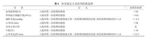 | 血氧饱和度(%) | 入院时第一次检测的数值 | <94 |