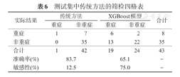 在训练集(n=100)中,使用传统方法(即采用入院时第一次检测的指标和重症入选条件进行评估患者是否为轻/重症)进行分类,可得到85.0%的预测准确率,31.8%的预测敏感性,即确诊的22例重症患者中只有7例被检测出来,漏诊率为68.2%。而使用模型预测方法的敏感率为61.7%,漏诊率为38.3%(表5)。