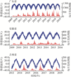 1. 基本情况:2009-2018年广东省、2009- 2015年安徽省和2013-2018年吉林省累计报告确诊手足口病病例数分别为3 188 767、635 932和65 488例。3个省份每日的报告发病数、体感温度、平均气压、日照时数和降水量见表1。在广东、吉林两省,手足口病发病数与体感温度的分布趋势基本一致,而安徽省的发病高峰则为体感温度上升阶段;广东省每年有2个发病高峰,而安徽省、吉林省仅有1个发病高峰(图1)。广东省发病高峰出现在4-6月和9-11月,安徽省和吉林省发病高峰分别在4-7月、7-8月。