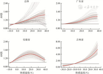 本研究探讨3个省份46个城市体感温度与手足口病的关系。总体上,气象条件的变化与手足口病的发病有一定的关系,手足口病的发病风险随体感温度的升高而增加。但是,广东省和吉林省的手足口病风险随体感温度上升而增加,而安徽省的手足口病风险在体感温度到达18.1 ℃高峰后下降,不同省份手足口病的空间异质性可能源于地理因素和气象条件的不同。