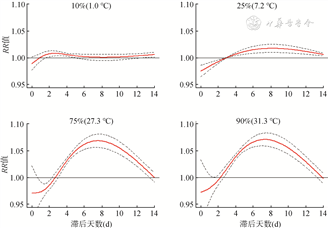 (2)体感温度对手足口病发病的滞后作用(图3):比较体感温度分别为10%、25%、75%和90%分位数时对手足口病发病的滞后作用。相比于较低的体感温度,较高的体感温度对手足口病的作用更大,持续时间也更长。10%分位数体感温度(1.0 ℃)的作用在滞后2~5 d及13~14 d有统计学意义,在第2天作用最大(RR=1.01,95%CI:1.00~1.01)。25%(7.2 ℃)、75%(27.3 ℃)和90%(31.3 ℃)分位数体感温度的滞后作用则主要从第3天开始有统计学意义,滞后7~8 d时风险最高,最高风险分别为1.02(95%CI:1.01~1.02)、1.07(95%CI:1.06~1.08)和1.07(95%CI:1.06~1.08)。