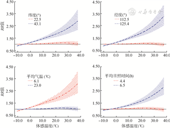 3个省份46个城市的每日体感温度与手足口病发病总体上呈非线性关系,广东省和吉林省的发病风险关系相似,即随体感温度升高而增加,而安徽省的发病风险随体感温度上升先增加,在18.1 ℃达峰值后下降。不同体感温度的滞后作用不同,较高体感温度的影响更大、持续时间更久。经纬度、平均气温和平均日照时数可能是体感温度与手足口病关系存在空间异质性的原因。