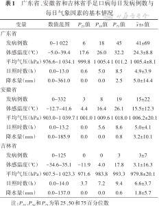 广东省、安徽省和吉林省手足口病每日发病例数与每日气象因素的基本情况