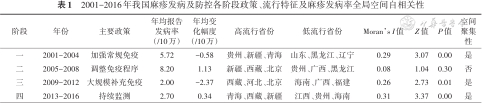 2001-2016年我国麻疹发病及防控各阶段政策、流行特征及麻疹发病率全局空间自相关性