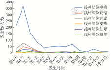 4. 不良反应发生时间分布:根据“疫苗接种信息采集系统”收集信息统计,局部反应中接种部位疼痛主要发生在接种当天及接种后24 h内;接种部位硬结主要发生在接种后的1~4 d内;接种部位肿胀、红晕、瘙痒及皮疹主要发生在接种后1周内。全身反应中接种后疲劳主要发生在接种当日及接种后的2 d内;接种后头痛主要发生在0~3 d内;肌肉痛主要发生在接种后0~3 d内,以第1天发生最多;发热、咳嗽、食欲不振、腹泻及过敏主要发生在接种后的1周内。见图1,2。