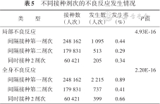5. 接种剂次与不良反应发生情况:对于局部不良反应,间隔接种第一剂次、间隔接种第二剂次与同时接种2剂次相比,差异有统计学意义(χ2=70.493,P=4.93×10-16)。采用LSD检验分析各组间差异,间隔接种第一剂次的局部不良反应发生率为0.44%,高于间隔接种第二剂次的局部不良反应发生率(0.29%)与同时接种2剂次的局部不良反应发生率(0.34%);后两者之间差异无统计学意义。见表5。