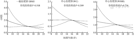 调整潜在的混杂后,初潮年龄与一般性肥胖和中心性肥胖均呈现线性负相关关系,初潮年龄每增长1岁,BMI、WC和WHtR定义的肥胖风险降低6%(OR=0.94,95%CI:0.90~0.99)、4%(OR=0.96,95%CI:0.92~1.00)和6%(OR=0.94,95%CI:0.90~0.99)。与初潮年龄14~岁组的女性相比,初潮年龄≥18岁组BMI(OR=0.71,95%CI:0.55~0.91)、WC(OR=0.75,95%CI:0.62~0.92)、WHtR(OR=0.76,95%CI:0.61~0.96)定义的肥胖风险分别降低29%、25%和24%。
