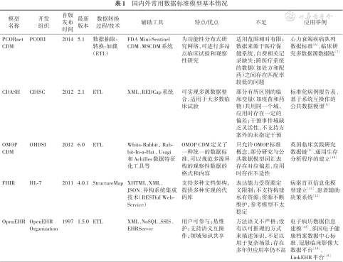 | OMOP CDM | OHDSI | 2012 | 6.0 | ETL | White-Rabbit、 Rabbit-In-a-Hat、 Usagi 和Achilles数据特征化工具等 | OMOP CDM定义了一种统一的数据标准,可以规范多源异构的观察性数据的格式和内容 | 只允许OMOP标准概念,部分研究与公共数据模型词汇表存在对应偏差,应用时存在不适性 | 英国临床实践研究数据链[9]、通用生存分析程序的建立[10] |