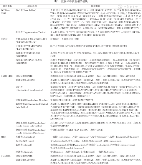 目前国内外常用的数据标准模型均为国外组织开发,适用于临床队列研究且较成熟的数据标准模型有:开放式电子健康档案(Open Electronic Health Record,OpenEHR)组织开发的开放式电子健康档案规范[1]、美国卫生信息传输标准(Health Level Seven,HL-7)组织开发的快速医疗互操作资源[2](Fast Healthcare Interoperability Resources,FHIR)、观察性健康数据科学和信息学(Observational Health Data Sciences and Informatics,OHDSI)协作组开发的通用数据模型[3](Common Data Model,OMOP CDM)、临床数据交换标准协会(Clinical Data Interchange Standards Consortium,CDISC)开发的临床数据获取协调标准[4](Clinical Data Acquisition Standards Harmonization,CDASH)、以患者为中心的结果研究所(Patient-Centered Outcomes Research Institute,PCORI)开发的通用数据模型[5](Common Data Model,PCORnet CDM)。以上5种数据标准模型的基本情况见表1,其具体的相关模块见表2。