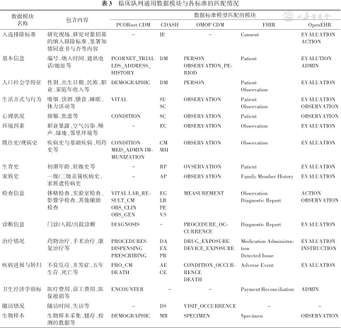 临床队列通用数据模块与各标准的匹配情况