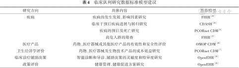 由于临床队列研究方向较多,包含疾病、药物、医疗器械和生物技术产品等,研究目的各有侧重,而不同数据标准模型的应用领域和优势特色也不尽相同。结合表1~3中所列的各模型及其模块特点和现有的应用实例来看,不难发现,FHIR中包含较全面的医疗保健的基本要素,并且涵盖病前期及相关暴露因素的信息收集,所以在研究疾病发生发展和影响因素的临床队列时首推FHIR标准;OMOP CDM 最初用于药物评价,其关于药物暴露、进展过程及症状等方面有详细的记录,所以在研究医疗产品安全性和有效性的临床队列则推荐OMOP CDM标准;CDASH适用于治疗领域的大多数临床试验,使通过多个研究收集的数据的定义标准化,且其包含随访模块,可在干预后获得其进展与转归信息,故在临床干预后疾病进展与转归研究中建议选择CDASH。具体的标准模型选择参考建议见表4。值得一提的是,一个临床队列研究的问题可以是多方面的,这时候模型的选择建议根据数据标准模型特点进行组合式选择。
