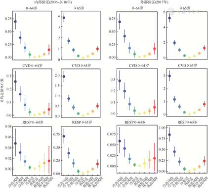 本研究存在局限性。首先,本研究以区(县)的气象数据替代个体的气象暴露情况,可能存在一定的测量偏倚;其次,本研究仅控制大气污染物PM10,未考虑其他大气污染物对气象因素与人群健康暴露反应关系的影响,但之前有研究指出空气污染对温度-死亡之间的关系影响不大[34];再次,既往研究表明,温度变异也是影响人群健康的一个重要气象因素[35, 36, 37],本研究在确定气象健康风险阈值时尚未考虑温度变异的影响,在以后的研究中要考虑温度变异的影响。