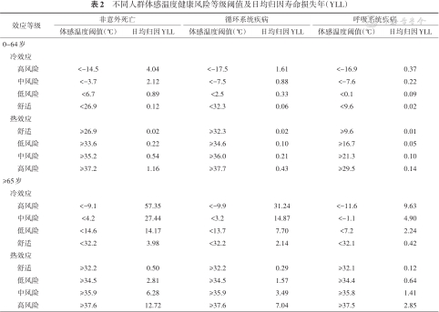 不同人群体感温度健康风险等级阈值及日均归因寿命损失年(YLL)
