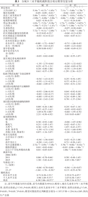 三水平随机截距混合效应模型的空模型拟合结果对数似然估计值-17 034.68,随机效应似然比检验χ2=483.06,P<0.001;社区分层组内相关系数(ICC)=9.97%,个人和社区水平总ICC=39.38%;三水平模型显示城市模型中城市化指数(β=-0.05,95%CI:-0.09~-0.01,P<0.05)、公园所在位置在本市另一居委会(β=-0.88,95%CI:-1.72~-0.04,P<0.05)、15~17岁组(β=-1.04,95%CI:-1.78~-0.30,P<0.05)与BMI值呈负相关,社区到最近健身房的距离(β=0.12,95%CI:0.02~0.22,P<0.05)、家庭彩电数(β=0.50,95%CI:0.08~0.92,P<0.05)、家长提示电视内容虚构的频率为3~4次/周(β=1.85,95%CI:0.70~3.00,P<0.05)与BMI值呈正相关;农村儿童青少年模型中的城市化指数(β=-0.04,95%CI:-0.07~-0.01,P<0.05)、农村人均收入(β=-7.29e-4,95%CI:-1.00e-3~-6.77e-5,P<0.05)、家长规定看电视的频率≥5次/周(β=-1.29,95%CI:-2.36~-0.21,P<0.05)、脂肪供能比(β=-0.03,95%CI:-0.06~-1.00e-3,P<0.05)与BMI值呈负相关,家长提示电视内容虚构的频率≥5次/周(β=3.01,95%CI:0.03~6.00,P<0.05)、调查时间为2015年(β=4.83,95%CI:1.96~7.69,P<0.05)与BMI值呈正相关。