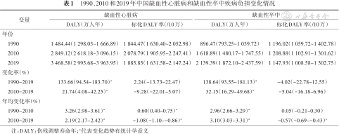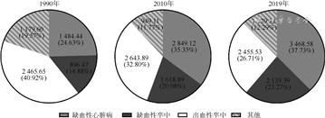 1990、2010和2019年中国缺血性心脏病和缺血性卒中疾病负担变化情况