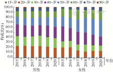 3. 年龄与性别分布:10 877例非婚非商业异性性传播HIV/AIDS的年龄(45.5±15.8)岁,年龄均值逐年增加(F=5.184,P<0.01);女性病例的年龄均值高于男性(t=-9.668,P<0.01)。年龄以40~岁组(22.5%)和50~岁组(19.4%)为主,不同年份的年龄构成差异,有统计学意义(χ2=77.377,P<0.01),不同年份的性别差异中,男性无统计学意义(χ2=30.628,P=0.43),女性有统计学意义(χ2=114.341,P<0.01)。女性病例中,<50岁组的构成比逐年减少(趋势χ2=69.888,P<0.01),表现为40~岁组的构成比逐年减少(趋势χ2=26.759,P<0.01),50~岁组的构成比逐年增加(趋势χ2=46.365,P<0.01);男性病例中,≤50岁组的构成比无时间变化趋势。见图1。