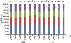 4. 首次CD4检测及结果:2015-2020年非婚非商业异性性传播HIV/AIDS中,90.5%的人开展了CD4检测,诊断15 d内开展CD4检测的构成比为43.0%。首次CD4的M(P25,P75)为298(143,462)个/μl,首次CD4中位数在不同年份和性别的差异无统计学意义(均P>0.05)。在有CD4检测结果的HIV/AIDS中,首次CD4<200个/μl的构成比为33.4%;首次CD4为200~个/μl的构成比为25.2%,由2015年的23.7%增加至2020年的26.9%(趋势χ2=13.981,P<0.01);首次CD4≥500个/μl的构成比为21.4%,由2015年的24.4%减少至2020年的19.3%(趋势χ2=18.961,P<0.01)。男性病例中,首次CD4<350个/μl的构成比逐年增加(趋势χ2=41.977,P<0.01)。见图2。