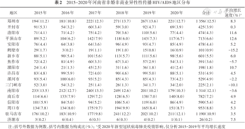 2. 地区分布:河南省174个县(区)均有非婚非商业异性性传播病例报告。主要分布在郑州市、南阳市、驻马店市、周口市、商丘市,集中了全省51.5%的病例;鹤壁市、濮阳市和济源市报告病例少,所占构成比均低于2%。排除2020年新冠疫情对艾滋病病例报告的影响,2015-2019年平均增长速度超过10%的有平顶山市、洛阳市和濮阳市,呈负增长的有鹤壁市、三门峡市、焦作市、南阳市和漯河市。见表2。
